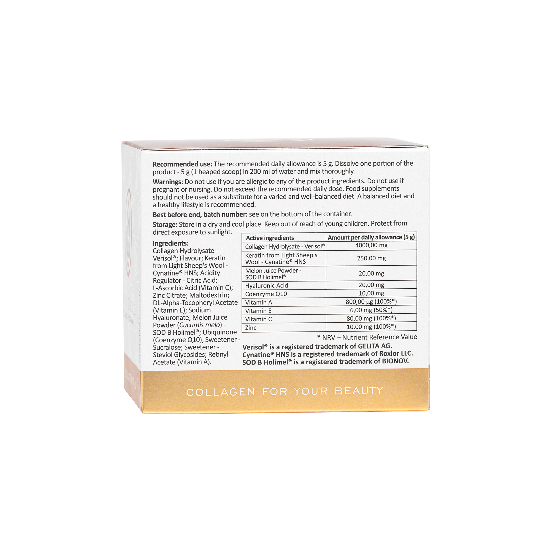 - Podwyższona* zawartość hydrolizatu kolagenu – Verisol®B – poprawia kondycję skóry, tworząc włókna kolagenowe w skórze. Skuteczność potwierdzona naukowo w badaniach przedklinicznych i klinicznych.